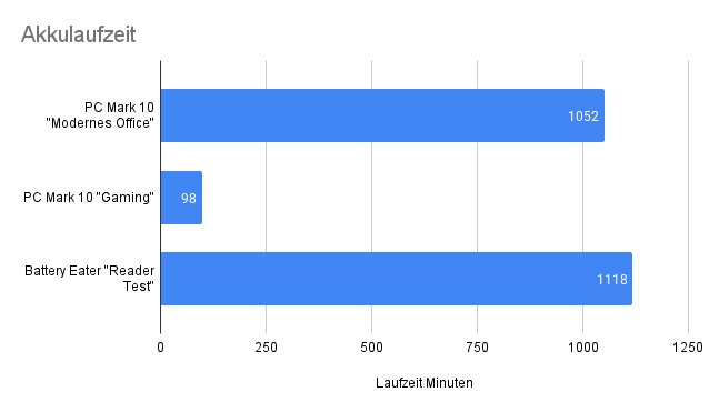 Und dann wäre da noch die Akkulaufzeit: Mehr als 17 Stunden im PC Mark (Modernes Office) sind eine echte Ansage. Selbst ein langer Arbeitstag lässt sich so problemlos bewältigen.