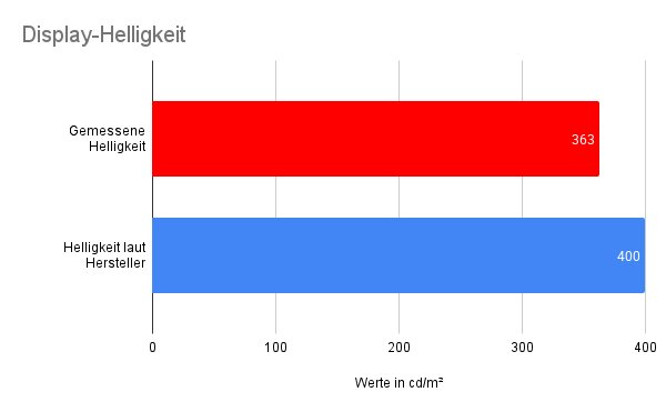 Die Helligkeit von 363 cd/m² (rund 610 cd/m² im Peak bei HD) dürfte für einen Einsatz im Außenbereich allerdings gerne noch etwas höher ausfallen. Dafür deckt das Panel den DCI-P3-Farbraum zu 100 Prozent ab, damit eignet sich das Display auch für professionelle Videobearbeitung.
