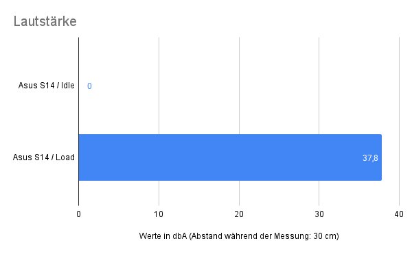 Mit maximal 37,8 Dezibel bleibt das Asus S14 auch unter Volllast erstaunlich leise. Mehr als ein leises Rauschen ist nicht zu vernehmen. Im Idle stehen die Lüfter meistens still und der Laptop arbeitet lautlos.