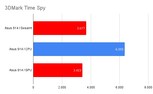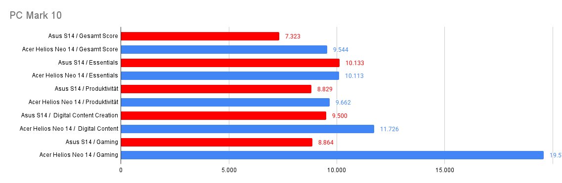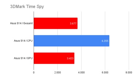 Bei der Akkulaufzeit zeigt das kleine Asus S14, was wirklich in ihm steckt. Im PC-Mark-Gaming-Benchmark ist die Leistung mit unter 2 Stunden nicht weltbewegend, das ändert sich dann aber im Office-Benchmark Modernes Office