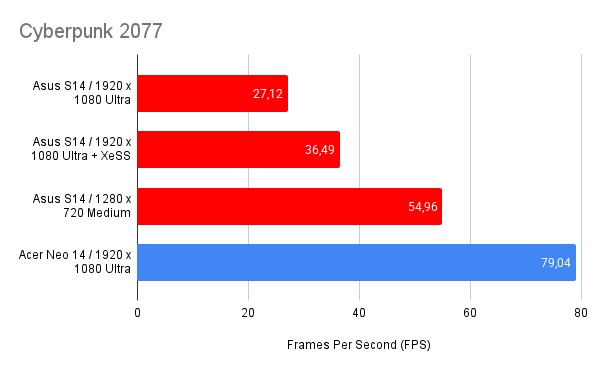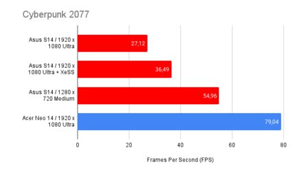 Wie üblich geht es mit Cyberpunk 2077 los. In FHD mit Ultra-Details erreicht die Arc 140V immerhin knapp über 27 FPS, mit Intels Upscaling-Technologie XeSS werden durchaus spielbare 36,49 FPS erreicht. In HD (720p) mit mittleren Details ist das Spiel mit über 50 FPS sehr gut spielbar.