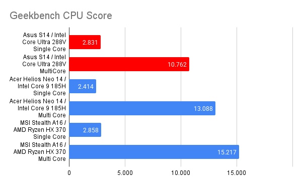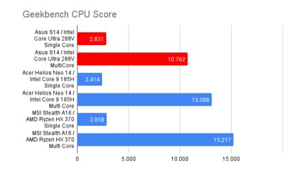 Im Geekbench schlägt sich der Core Ultra 288V gut. Im Single-Core erreicht fast die Leistung von AMDs HX 370. Im Multi-Core muss er sich im Testfeld hinten anstellen. Allerdings besitzt der 288V auch nur 8 Kerne während das AMD Modell 12 und der Intel Core 9 185H sogar 16 Kerne hat.