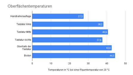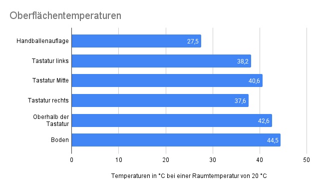 Auch bei den Oberflächentemperaturen gibt es keinen Anlass zur Kritik. Mit maximal 44,5 °C erwärmt sich das Gehäuse am Boden zwar deutlich, dieser Wert ist aber noch kein Problem. Das S14 kann also unterwegs problemlos auf den Oberschenkeln abgelegt werden.