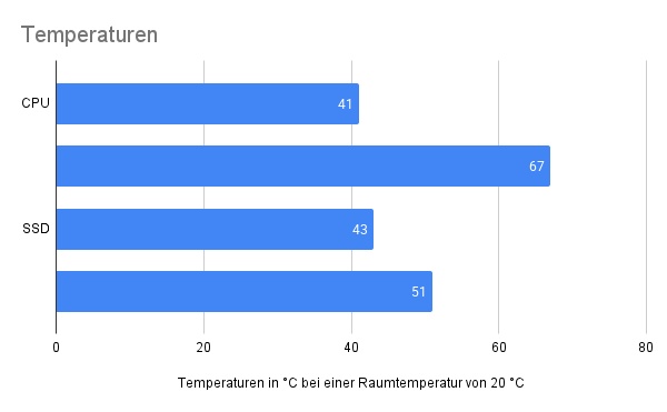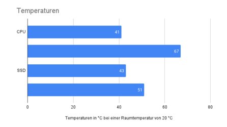 Die erreichten Temperaturwerte der CPU inkl. der integrierten Grafik sind völlig unbedenklich. Lediglich die SSD dürfte unter Last etwas kühler sein, aber auch hier sind die Werte unkritisch.