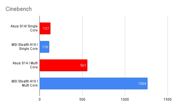 Beim PC Mark 10 hält das Asus S14 relativ gut mit dem 185H Prozessor des Acer Neo 14 mit, zumindest wenn man berücksichtigt, dass die CPU des S14 mit 8 Kernen weniger auskommen muss. Den Gaming-Teil dominiert wenig überraschend das Acer Neo 14 mit seiner RTX 4070m, die mehr als doppelt so schnell ist. Dennoch hält sich die Arc 140V im Asus Laptop für eine integrierte Grafiklösung durchaus wacker.