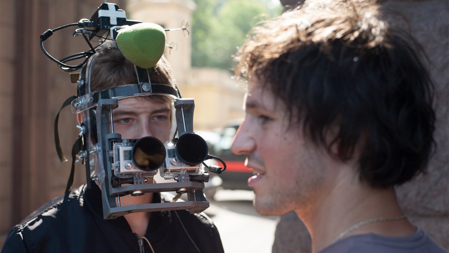 Zu sehen ist der Schauspieler, wie er mittels einer Kamera-Konstruktion spontan zwischen Nahaufnahmen und Ego-Perspektive wechselt.
