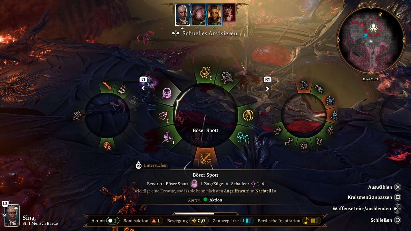 Außerdem finde ich auch die Sortierung der Aktionen besser gelungen. Die sind nun nicht mehr in einem Raster aneinander geordnet, sondern finden sich in (auch zusätzlich erstellbaren) Kreismenüs wieder, zwischen denen ich bequem hin- und herschalten kann. Hier habe ich nun freie Wahl, wie ich meine Fähigkeiten sortieren will.