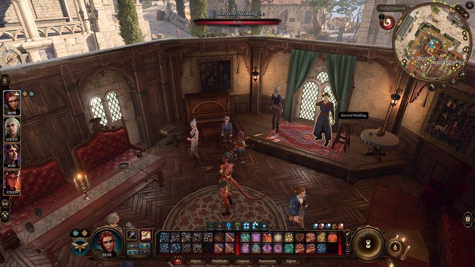 - Reist in die Unterstadt von Baldur’s Tor und begebt euch in die Taverne Elfgesang. Dort findet ihr einen Komiker mit dem allzu bekannten Namen Harvard Willoughby. Es kann natürlich nicht zwei Figuren mit dem gleichen Namen geben, daher müsst ihr den zweitklassigen Witzereißer töten. Bedenkt, dass ihr damit dem gesamten Etablissment den Kampf ansagt.