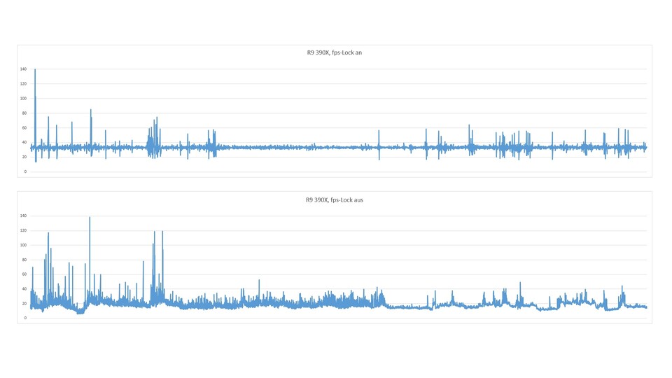 Solche Einbrüche der fps lassen sich gut mit Frametime-Verläufen wie diesen darstellen. Die Kurven auf den Bildern stellen dar, wieviele Millisekunden es im Verlauf unserer Testsequenz jeweils dauert, bis ein einzelner Frame berechnet wurde (oben mit fps-Lock, unten ohne fps-Lock). Je niedriger und gleichmäßiger die Kurve verläuft, desto flüssiger und angenehmer ist das Spielgefühl. Eines fällt dabei direkt auf: Im hinteren Drittel unserer Testsequenz, in dem wir mit dem Batmobil unterwegs sind, verlaufen die Frametimes generell unruhiger. Schnelle Grafikkarten und Modelle von Nvidia sind davon tendenziell etwas weniger betroffen, das Phänomen betrifft letztlich aber alle getesteten Karten.