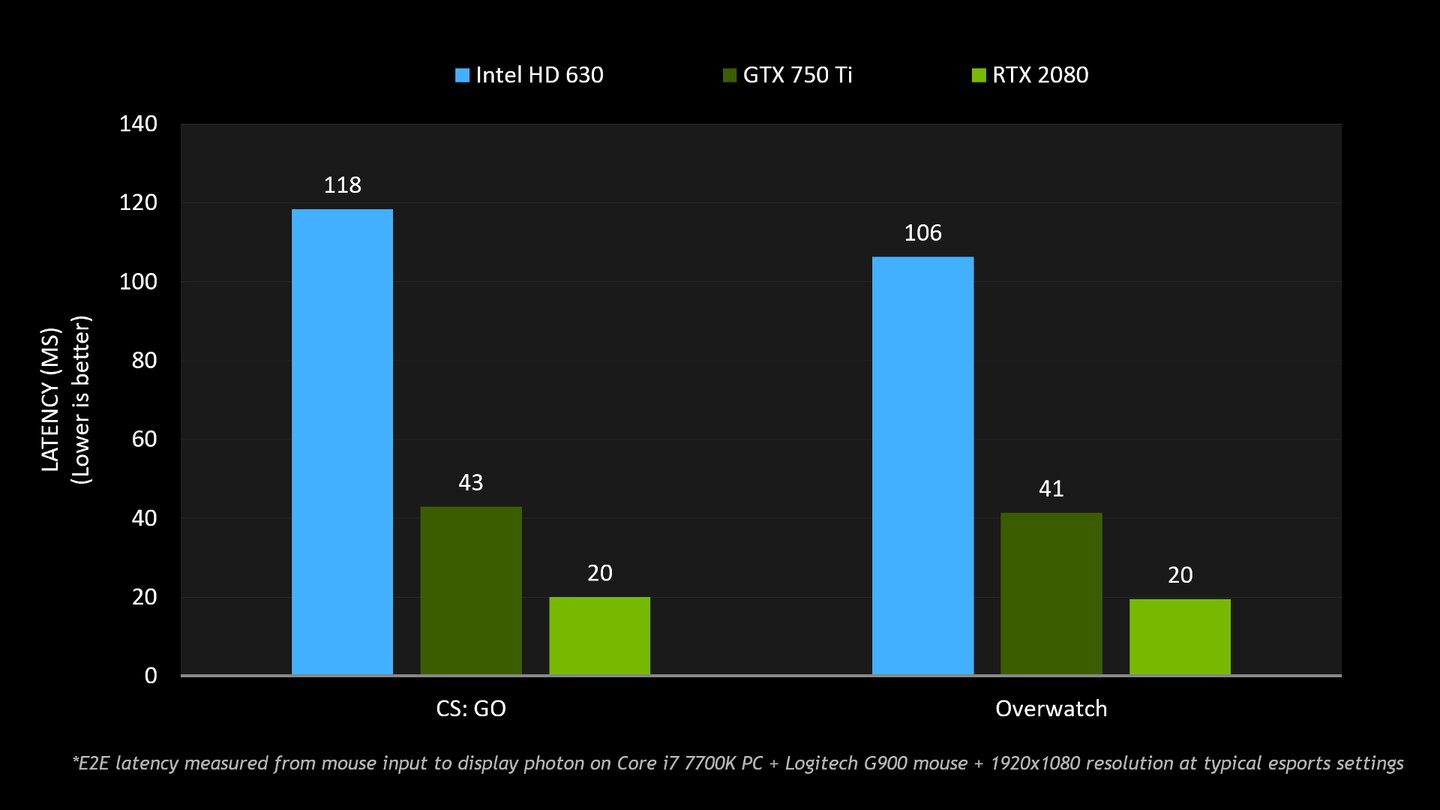 Außerdem ist eine Grafik zu sehen, die die Verzögerung einer Mauseingabe bis zur Darstellung auf dem Monitor zwischen drei GPUs in Full HD und bei »typischen Esports-Settings« vergleicht: Intels CPU-Grafikeinheit HD 630 sowie Nvidias dedizierte GPUs Geforce GTX 750 Ti und Geforce RTX 2080. Genaue Angaben zum verwendeten Display finden sich dabei nicht.