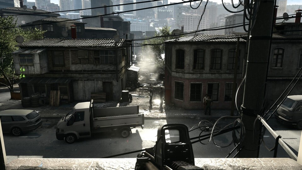Die Funken der in dem Auto von Szene 2 einschlagenden Minigun-Geschosse fehlt auf »Niedrig« beispielsweise ganz. Von »Mittel« auf »Hoch« steigert sich die Dichte der Effekte noch einmal, wohingegen zwischen »Hoch« und »Ultra« kein nennenswerter Unterschied erkennbar ist. Sollte Ihnen beim Spielen auffallen, dass die Framerate vor allem während großer Explosionen in den Keller geht, ist es eine gute Option, am Regler für die Effektqualität Hand anzulegen. Die mittlere Stufe bietet den besten Kompromiss aus Leistung und Optik.