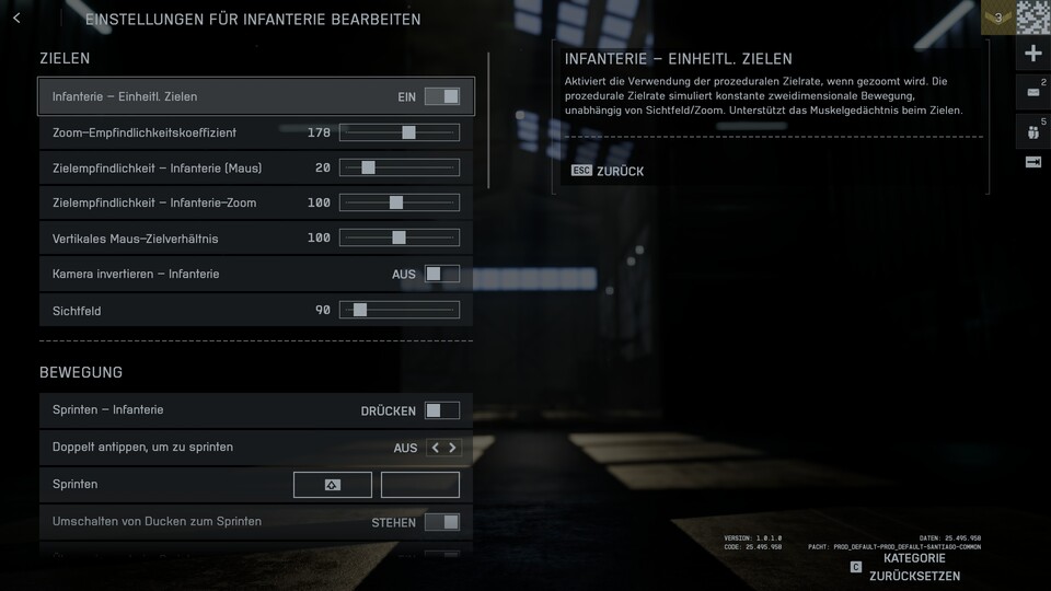 - Stellt den Wert »Zoom-Empfindlichkeitskoeffizient« auf 0. Aktiviert die »Infanterie – Einheitl. Zielen«-Option im Anschluss wieder.