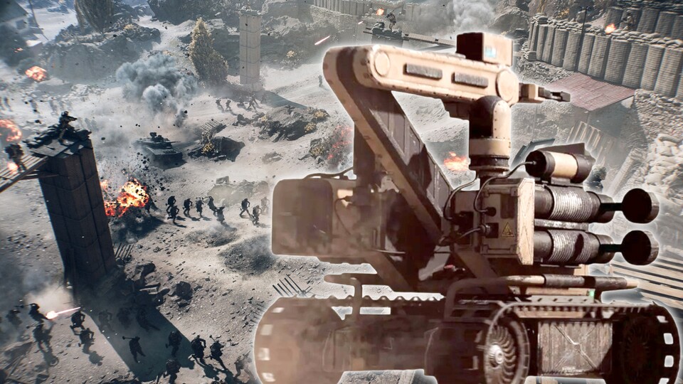 Am rechten oberen Bildschirmrand in der Perspektive der Roboterkamera ist zudem eine Anzeige zu sehen, die wie ein Akkustand aussieht. Es ist also möglich, dass die Nutzung des Bots zeitlich begrenzt ist. Optisch ist der Bot deutlich größer und massiver als seine Vorgänger aus Battlefield 3, 4 und 2042.
