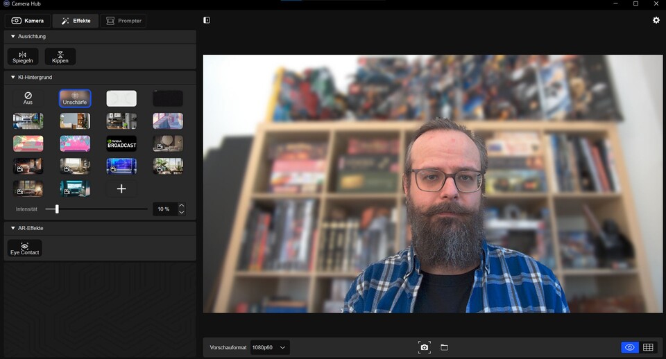 Im Camera Hub gibt es außerdem die Möglichkeit, bestimmte Effekte zu aktivieren. Unschärfe und Hintergründe dürften die meisten schon kennen und meist funktioniert das auch einigermaßen gut. Der »Eye Contact«-Effekt, der die Blickrichtung der Augen automatisch in Richtung Kamera korrigiert, mag unter Umständen Sinn ergeben, wirkt aber etwas befremdlich.