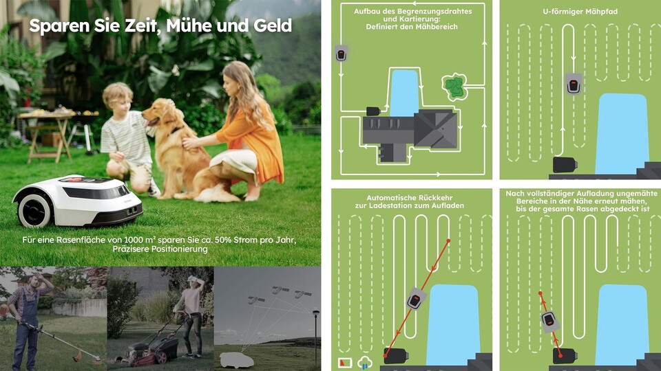 Funktionalität: Nach der Installation führt der Roboter eine Kennenlernrunde durch, um den Garten zu kartographieren – eine tolle Funktion! Danach kann der Mähvorgang starten. Besonders gefällt uns, dass man zwischen parallelem und kreuzweisem Mähen wählen kann, was für eine gleichmäßige Rasenpflege sorgt. Im Herbst konnten wir das Rasenbild noch nicht abschließend beurteilen, aber wir freuen uns darauf, den Roboter im Frühjahr in voller Aktion zu erleben.