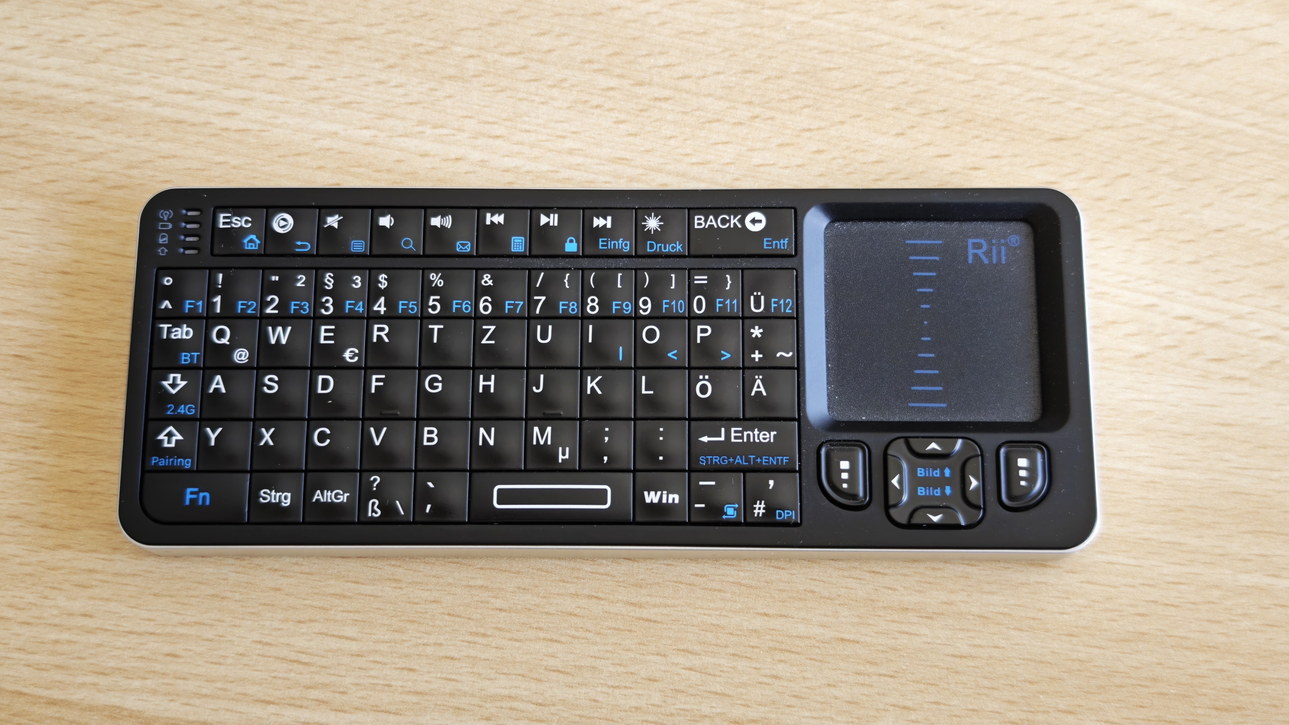 Um die Bedienung bequem vom Sofa möglich zu machen, habe ich mir außerdem eine kleine 2,4-GHz-Fernbedienung mit eingebauter Tastatur und Trackpad gekauft. Es ist wichtig, den USB-Dongle vorne anzuschließen, weil der Empfang mit den hinteren USB-Anschlüssen deutlich schlechter war; schade, dass ich dafür einen der schnelleren USB 3.1-Ports opfern musste.