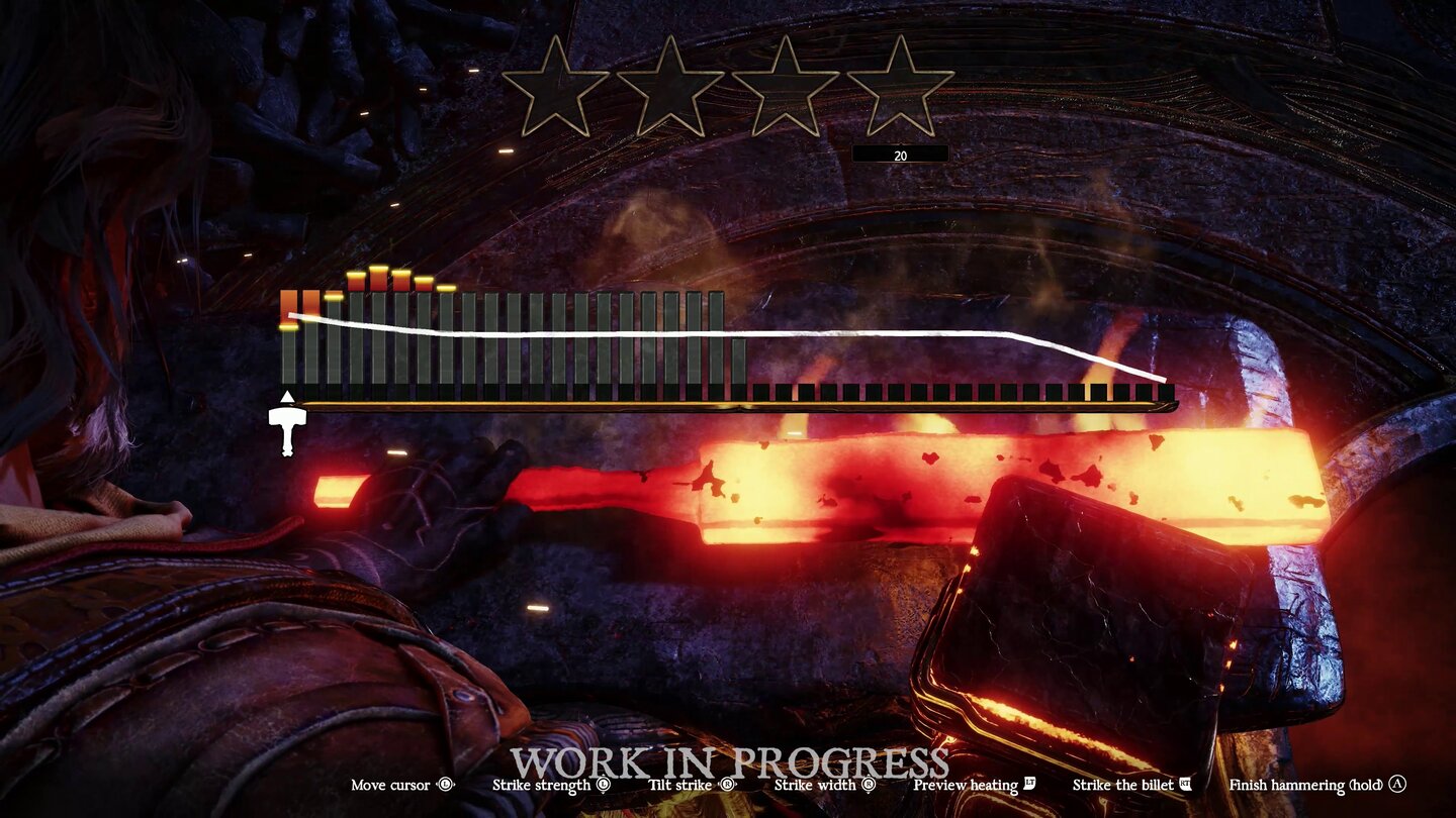 Erst jetzt beginnt aber der Schmiedeprozess selbst. Unser glühendes Eisen bearbeiten wir mit gezielten Schlägen, deren Richtung und Stärke wir auswählen. Ziel ist es, unsere Waffe möglichst genau an eine vorgegebene Form anzupassen. Je näher wir der Vorgabe kommen, desto höher ihre Stufe. Allerdings dürfen wir nicht zu lange auf unserer Waffe herumhämmern, sonst sinkt deren Qualität immer weiter.