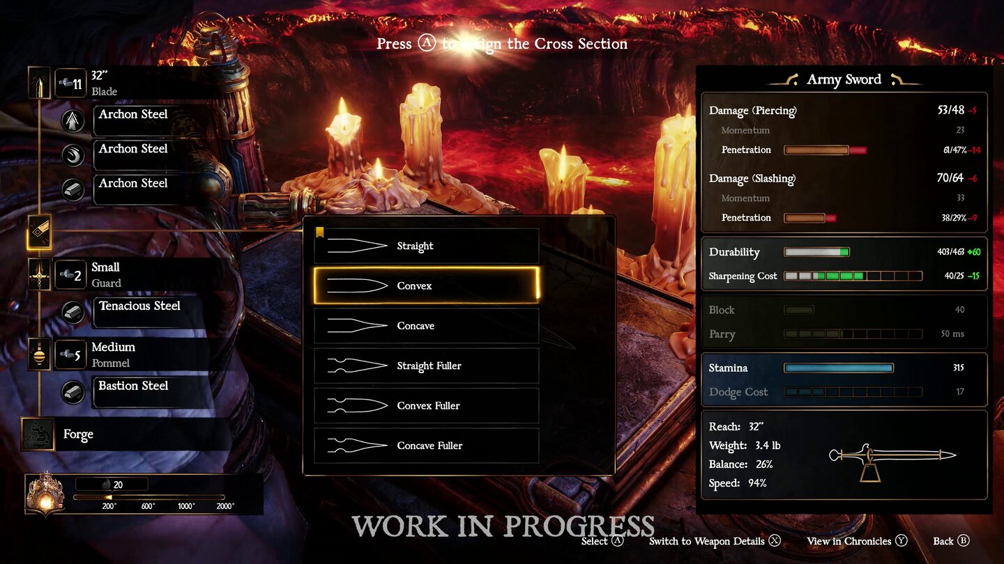 Mit der Auswahl unserer Waffe ist es jedoch längst nicht getan: In der Schmiede müssen wir erst einmal die gewünschten Stahl- und Holzarten wählen sowie die Größe und Form der einzelnen Teile wie Kopf, Klinge, Schaft oder Parierstange anpassen. So bestimmen wir den Schaden und die Reichweite unserer Waffe und sorgen etwa dafür, dass sie länger hält oder einfacher Rüstungen durchschlägt: