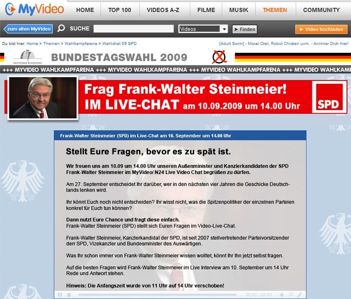 Angesichts von Wirtschaftskrise und steigenden Arbeitslosenzahlen geraten im Bundestags-Wahlkampf Themen wie Jugendschutz, Meinungsfreiheit und Internet-Zensur schnell in den Hintergrund. Damit dies nicht geschieht, müssen Sie Ihrem Anliegen eine Stimme verleihen. An diesem Donnerstag, den 10. September veranstaltet die Videoplattform MyVideo zusammen mit dem Nachrichtensender N24 eine Live-Fragestunde mit Außenminister und SPD-Kanzlerkandidat Frank-Walter Steinmeier.