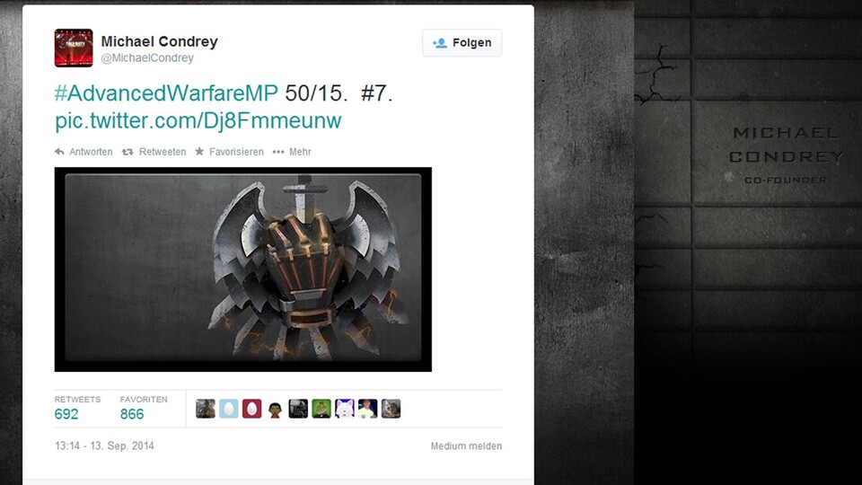 Der etwas kryptische Tweet den es auf dem Bild über dieser Meldung zu sehen gibt stammt von Michael Condrey, einer der Gründer des Studios Sledgehammer Games. Damit scheint der Entwickler einen Hinweis auf die Verteilung der Ränge und Prestigestufen in Call of Duty: Advanced Warfare geben zu wollen. Wie viele Call-of-Duty-Fans daraufhin anmerkten, dürfte »50/15« nämlich für 50 Ränge und 15 Prestigestufen stehen.