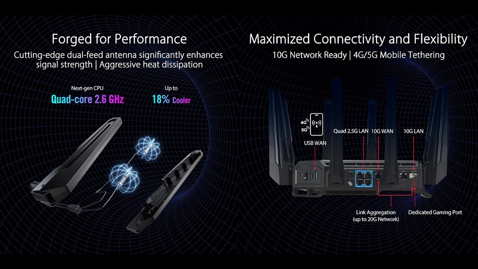 Der ASUS ROG Rapture GT-BE98 bietet nicht nur herausragende drahtlose Verbindungen, sondern auch maximale kabelgebundene Konnektivität. Mit zwei 10Gigabit-Ports und vier 2,5Gigabit-Ports ist der Router bestens für bandbreitenintensive Spiele und Anwendungen gerüstet. Die Vielzahl von Anschlussmöglichkeiten ermöglicht eine flexible Nutzung, egal ob für Gaming, Streaming oder andere Anwendungen.