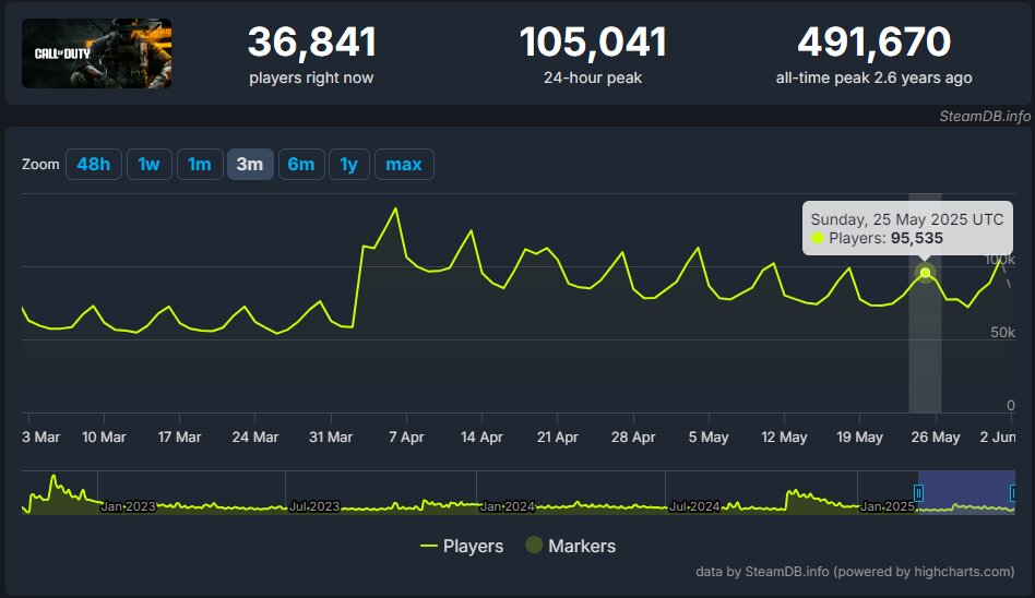 In den eigentlichen Spielerzahlen schlägt sich die Kritik kaum nieder. Ja, den gigantischen Höchststand zur Rückkehr von Verdansk Anfang April 2025 konnte das Spiel nie wieder erreichen, doch wir reden hier von einer Differenz von nur 30.000 bis 40.000 Leuten. CoD erreicht immer noch 100.000 gleichzeitig aktive Spielerinnen und Spieler pro Tag.