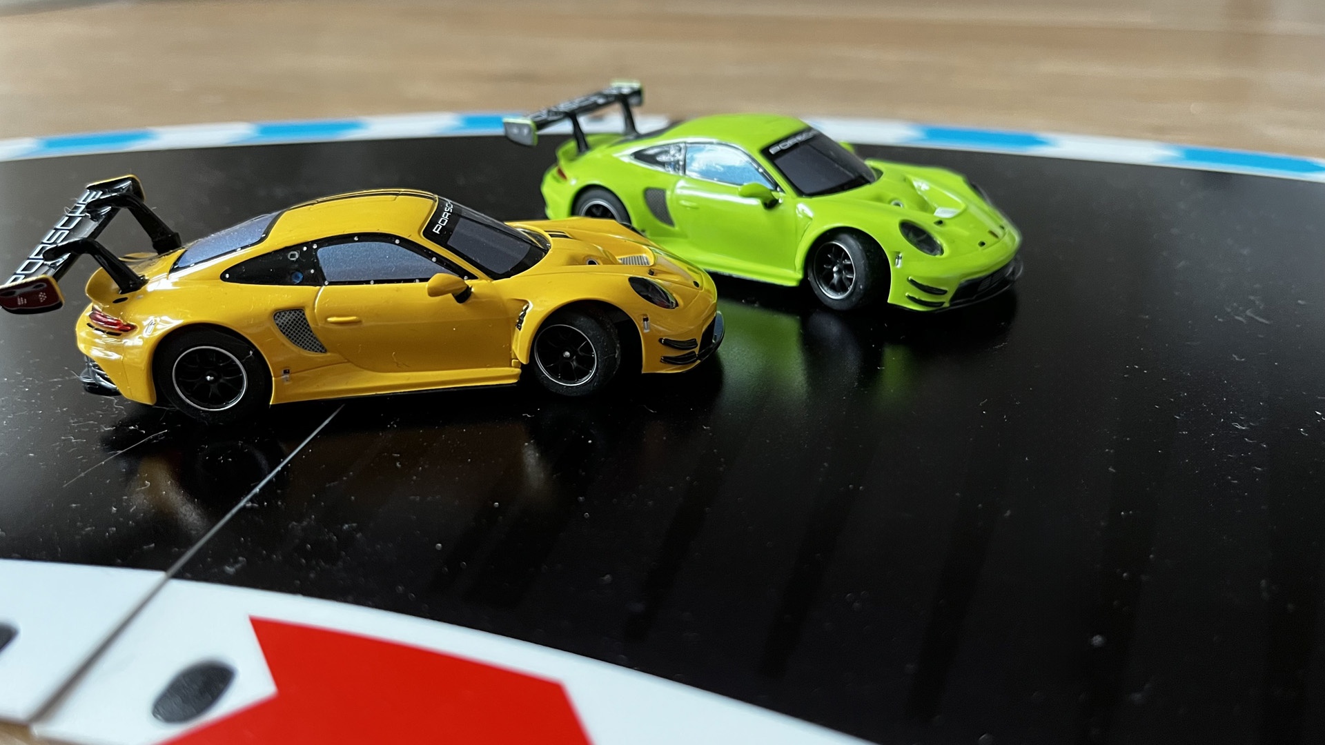 Der Unterschied liegt lediglich in der Farbe der Flitzer. Bei meinem Set ist ein Porsche 911 GT3 R in Grün und Gelb im Maßstab 1:50 (9,5 Zentimeter) enthalten.