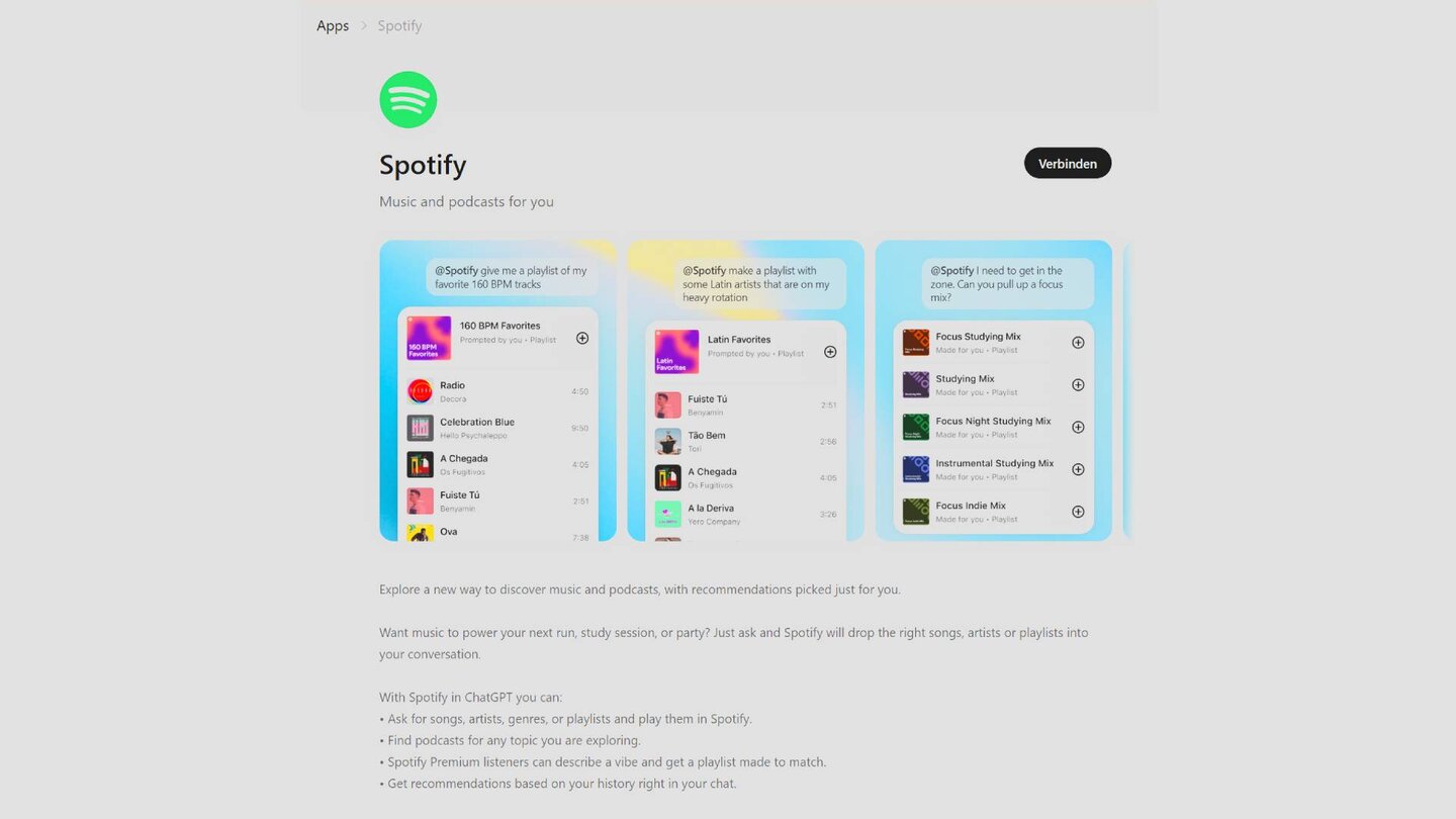 Beispiel anhand von Spotify: Wenn der Streamingdienst verbunden ist, kann ChatGPT etwa Podcasts zu einem bestimmten Thema finden, nach bestimmten Songs, Artists oder Genres suchen und diese abspielen oder ganze Playlists erstellen.