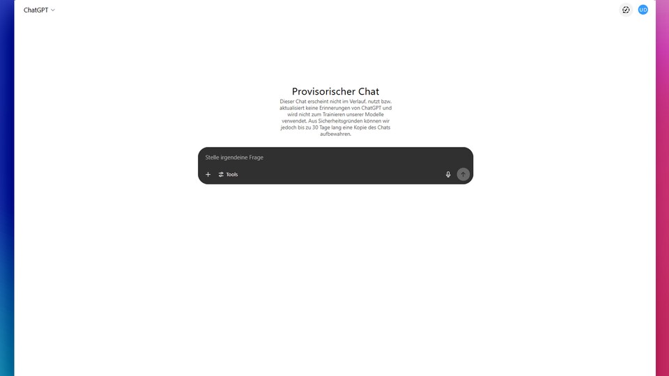 Eigentlich hatte ich auch geschrieben: Die provisorischen Chats werden nach 30 Tagen von den Servern von OpenAI gelöscht. Das gibt die Firma im Fenster des provisorischen Chats auch immer noch an, es stimmt aber zumindest zurzeit leider nicht: