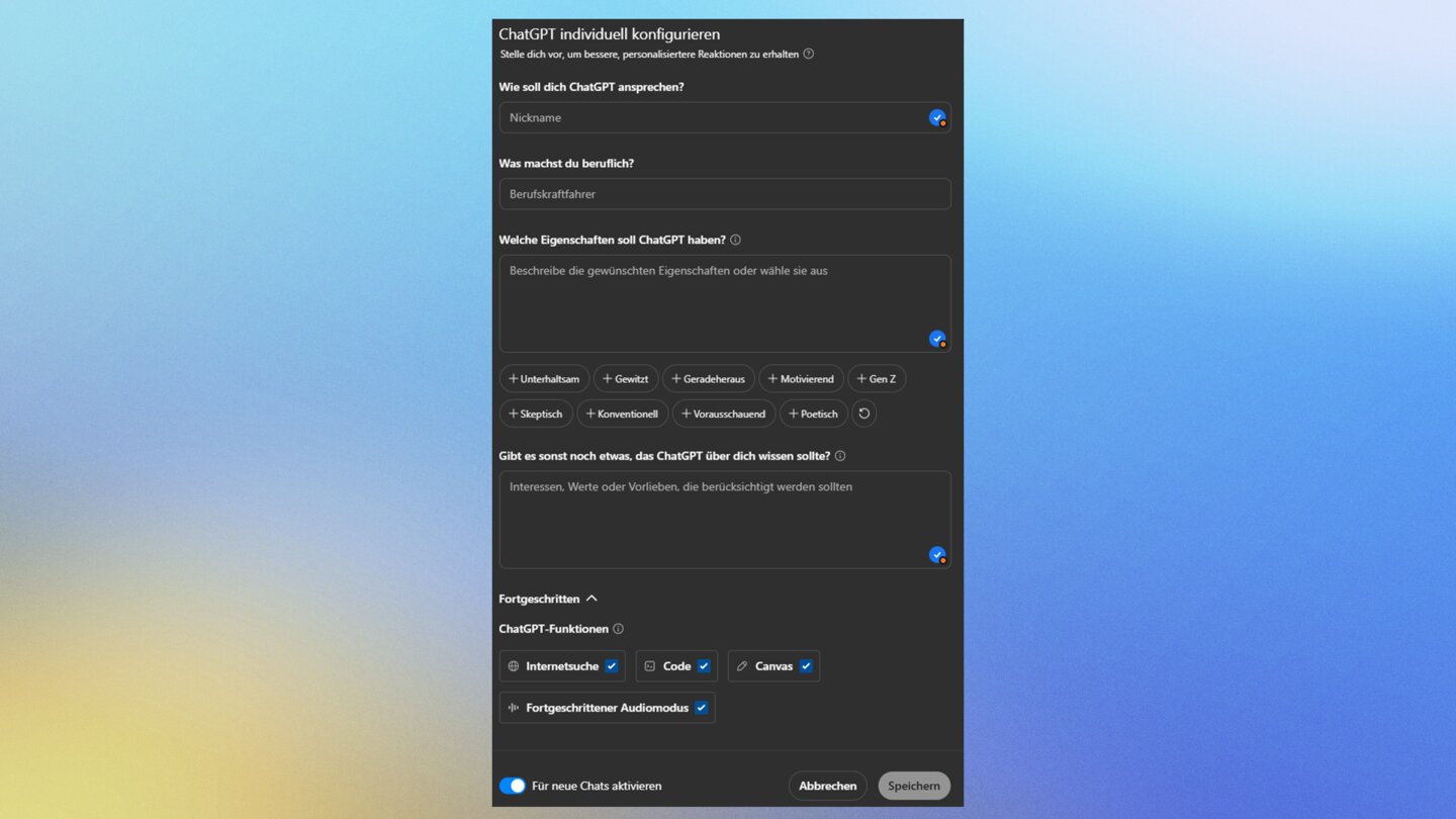 Natürlich geht es hier auch um einfache Individualisierungen, die sich nicht unbedingt auf die Ergebnisse auswirken. Der Spitzname sagt beispielsweise nur, wie euch ChatGPT anspricht.