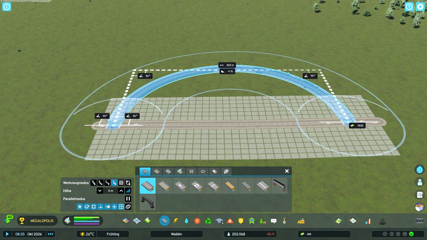 Neben S-Kurven könnt ihr so auch geschwungene Kurven bauen und Querverbindungen mit anderen Straßen im rechten Winkel erstellen. Auch für Abfahrten von Autobahnen sind komplexe Kurven hilfreich.