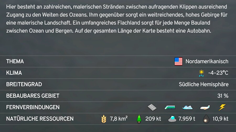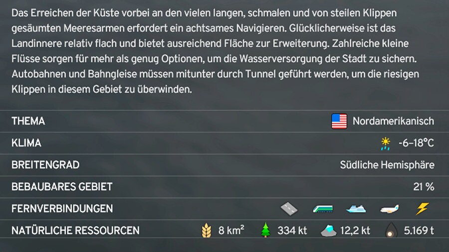 Die Karte ist sehr gut für die ersten Gehversuche mit eingeschränkter Baufläche und natürlichen Grenzen geeignet. Die seichten Küstenabschnitte wechseln sich mit felsigen Abschnitten ab und bieten idealen Baugrund für Häfen. Die Gebirgsausläufer ziehen sich weit gen Süden. Dorthin solltet ihr erst expandieren, wenn ihr sicher seid oder dort spezialisierte Industrie ansiedeln wollt.