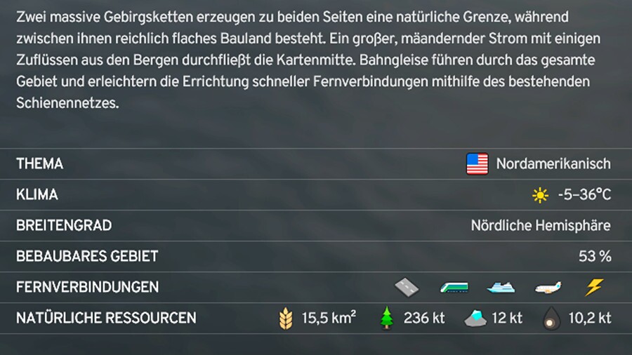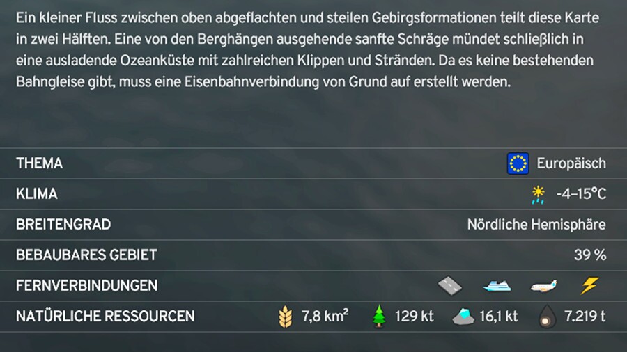 Insgesamt ist die Karte perfekt, um die Mechaniken des Spiels zu erlernen und in aller Ruhe und ohne Druck eine Stadt zu entwickeln. Es gibt einige kleinere Hürden wie den Zugbau, aber nichts, was unmöglich zu bewältigen ist. Erzabbau ist die größte natürliche Ressource auf der Karte. Alle anderen sind moderat vorhanden. Eine gute Möglichkeit, um den Umgang mit diesen Spezialgütern zu üben.