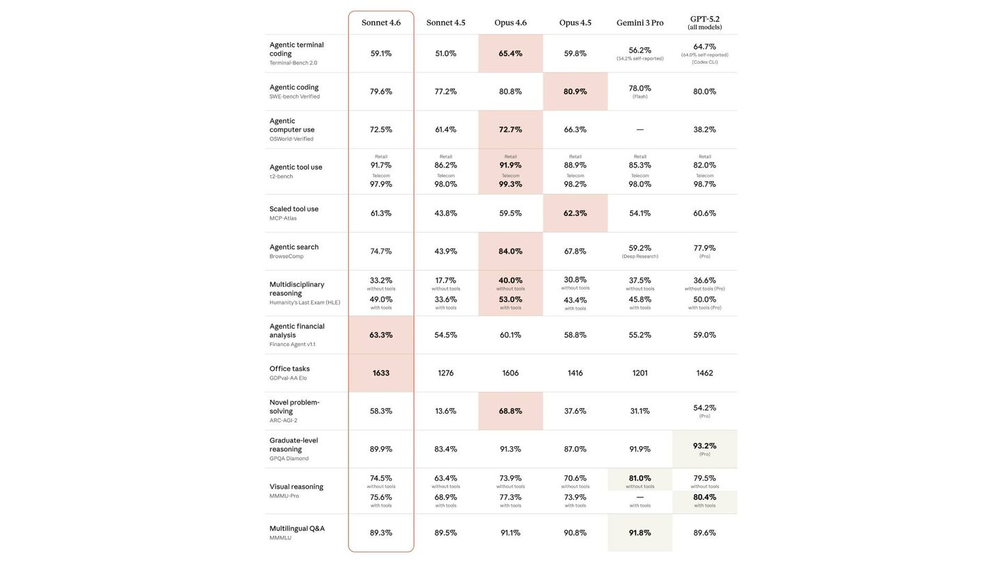 Anthropic hat das neue KI-Modell Sonnet 4.6 vorgestellt. In einigen Benchmark-Tests wurden dabei bessere Werte als mit Gemini 3 Pro und ChatGPT 5.2 erzielt. Sogar das hauseigene Top-Modell Opus 4.6 hat teilweise das Nachsehen.