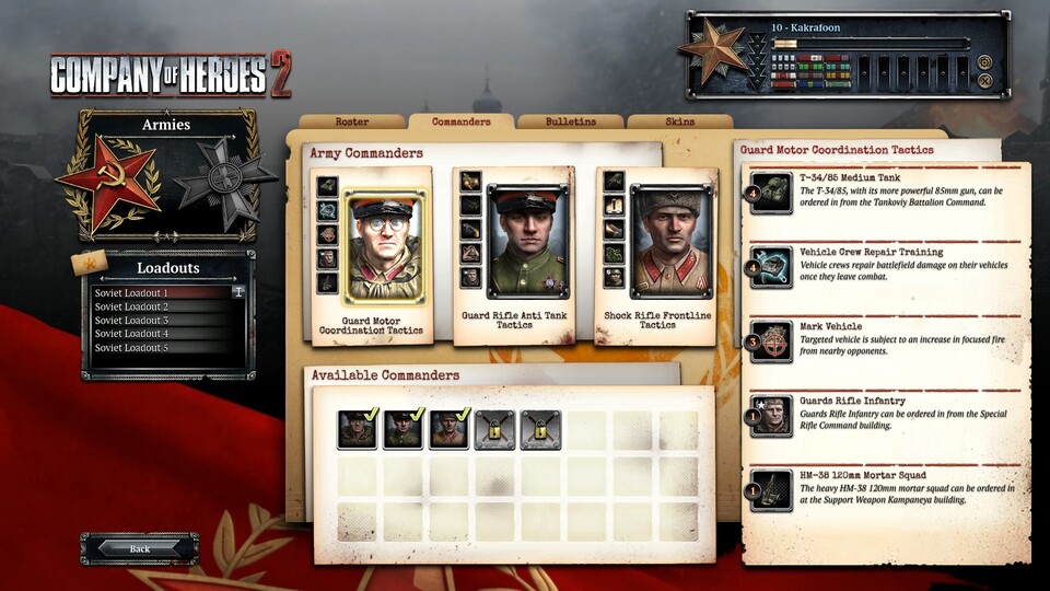 Guard Motor Coordination Gleich zwei verbesserte Einheiten darf dieser Kommandeur einsetzen: Der 80-Millimeter-Mörser wird durch ein brachiales 120-Millimeter-Modell ersetzt, und der T-34-Panzer darf als verbesserte Ausführung mit der 85-Millimeter-Langrohrkanone eingesetzt werden. Ein weiteres Plus bei Offensivoperationen: Die Crews beschädigter Fahrzeuge können ihre Vehikel selber zusammenflicken.