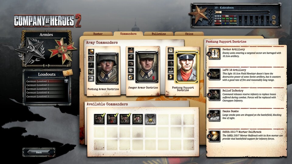 Guard Rifle Anti-Tank Der Name dieses Kommandanten trifft nicht ganz zu: Besondere Panzerabwehr-Fähigkeiten kann er gar nicht vorweisen, dafür verfügt er über drei Ikonen der Roten Armee: stationär baubare 152-Millimeter-Haubitzen, den IL-2 Sturmovik-Bomber als Call-In-Fähigkeit, und zähe Rekrutentrupps die er mit Maschinenpistolen aufwerten und dem Gegner als menschliche Welle entgegenwerfen kann.