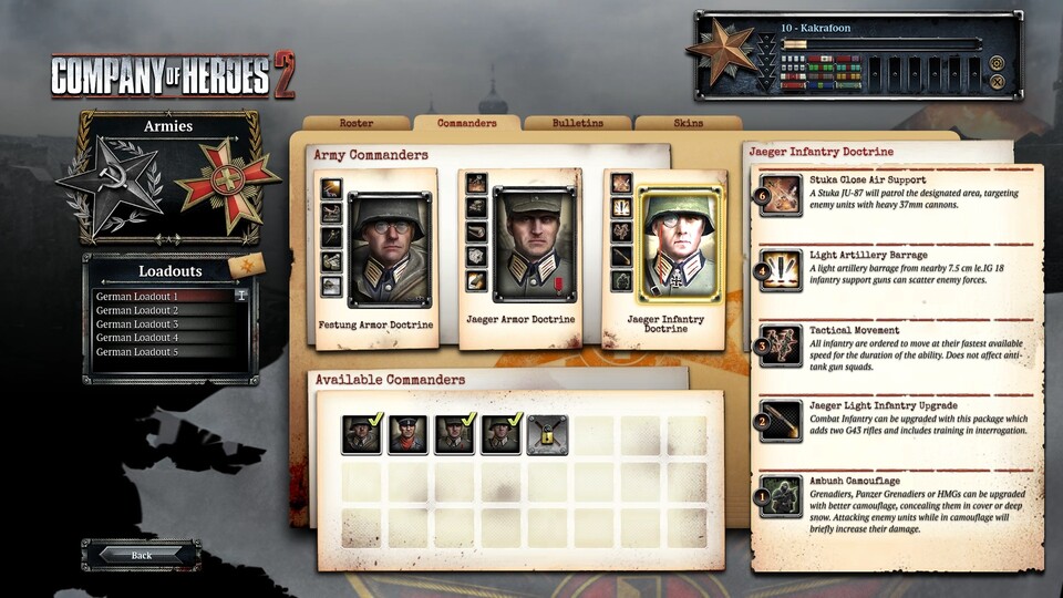 Die deutschen Kommandeure sind in zwei verschiedene Waffengattungen aufgeteilt. Festungs-Kommandanten haben mehr defensive Fähigkeiten, während die Jaeger-Kommandeure auch offensiv nützlich sind. In der offenen Beta-Phase von Company of Heroes 2 verfügt jede Fraktion über fünf Kommandeure, von denen drei zu Beginn freigeschaltet sind. Für die deutsche Seite kommt ab Level 9 »Jaeger Infantry« als erster freispielbarer Kommandeur dazu.