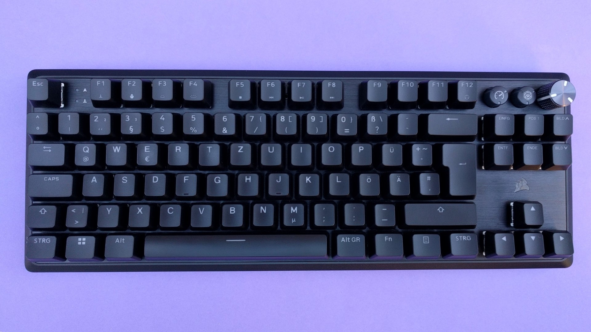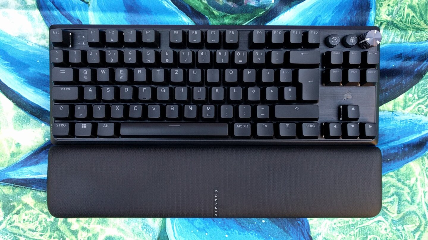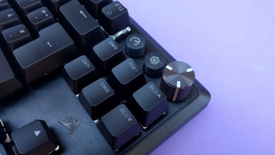 Die Optik der Corsair K70 Pro TKL ist schlicht gehalten mit vereinzelten Hervorhebungen wie dem Lautstärkerad aus Metall oben rechts, dem gerillten Metallkreis auf der Unterseite oder dem eingelassenen Corsair-Logo auf der Handgelenkablage.