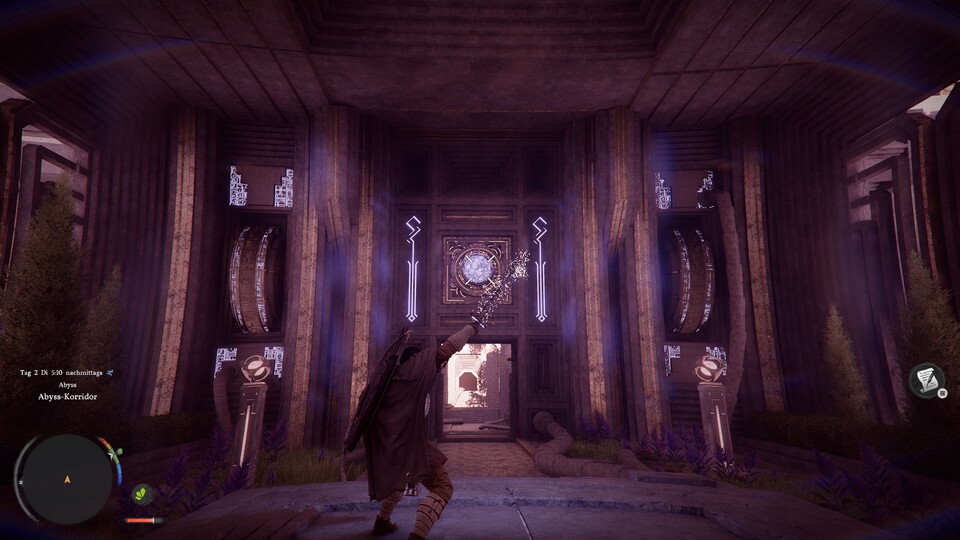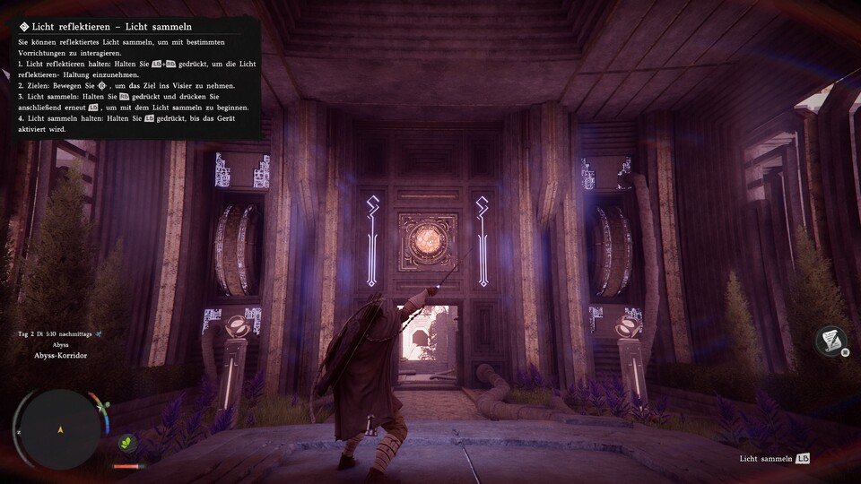Haltet jetzt erneut (zusätzlich zur Taste, die ihr immer noch gedrückt haltet) LB/L1/Strg gedrückt. Kliff sammelt jetzt Licht in seinem Schwert. Bewegt die Kamera mit dem rechten Stick oder der Maus, bis der Lichtstrahl den Schalter über der Tür trifft. Et voilà! Ihr könnt durch die Tür gehen.