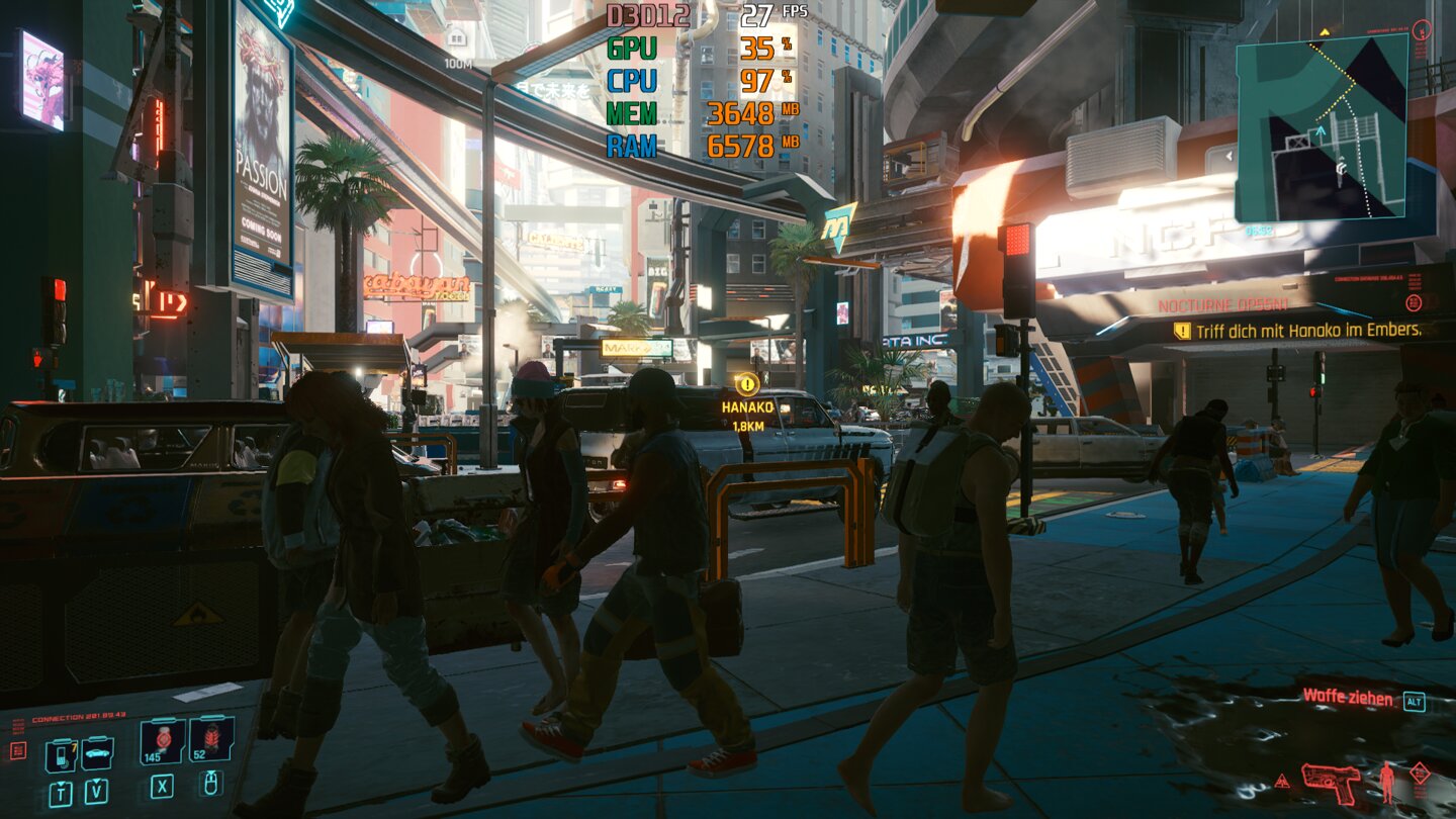 Die Mengendichte in den Gameplay-Optionen zu reduzieren kann vor allem langsameren CPUs entgegenkommen und bringt uns durchschnittlich ein Plus von etwa 5 FPS. Es kommt allerdings immer noch ständig zu starken Einbrüchen der Bildrate, die Cyberpunk letztlich unspielbar machen.