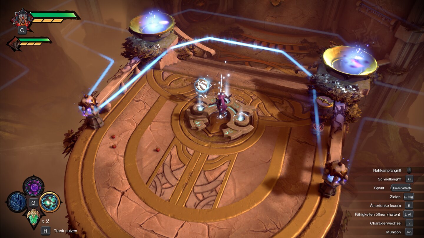 Strife kann beispielsweise mit der Leerebombe zwei fest definierten Orte mit einem Portal verbinden, während War mit der Vorpalklinge nicht nur weit entfernte Schalter aktivieren, sondern auch Feuer von einer Quelle zur nächsten transportieren und damit beispielsweise Stachelbomben anzünden kann. Gerade im späteren Spielverlauf setzen die Entwickler auf die Kombination der Fähigkeiten der Charaktere, und die Knobelei ist eine angenehme Abwechslung zur Haudrauf-Action.