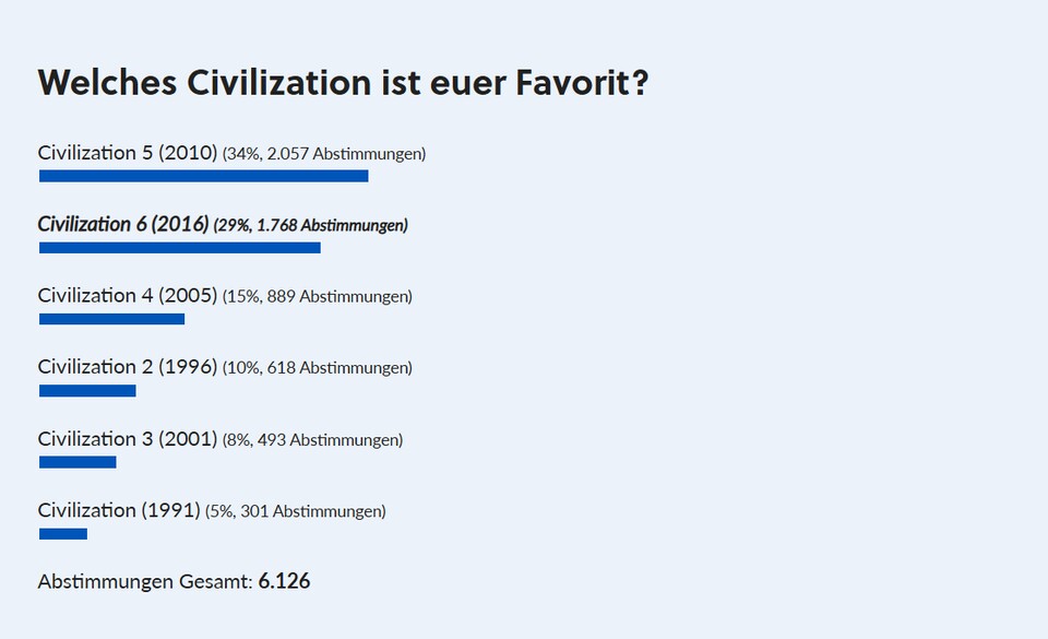 Was ihr anhand der Stimmabgaben merkt: Diese Umfrage stieß bei euch auf großes Interesse. Vielen Dank für eure rege Teilnahme! Wir holen die Umfrage also bestimmt noch einmal nach, sobald Civilization 7 demnächst erschienen ist und ihr eine Zeit lang spielen konntet.