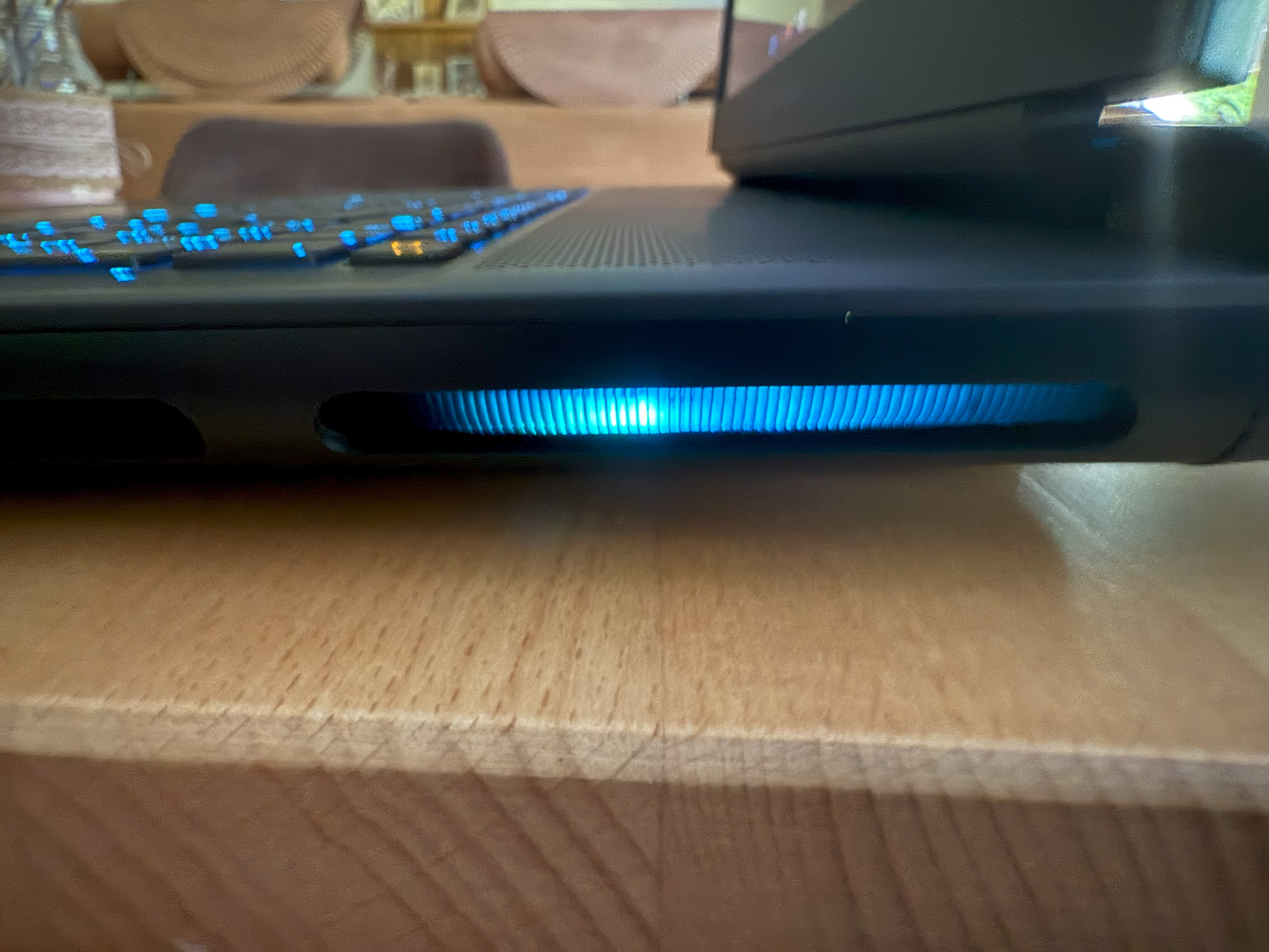 Auch hier geht Alienware einen anderen Weg: Über den Luftauslässen am Heck befindet sich ein Lichtstreifen unter einer halbtransparenten Abdeckung. Das bedeutet, wer die Beleuchtung deaktiviert, sieht nicht, dass das Area 51 überhaupt eine solche besitzt. Es ist bisher das einzige Notebook überhaupt, bei dem ich nicht auf die Beleuchtung verzichten möchte.