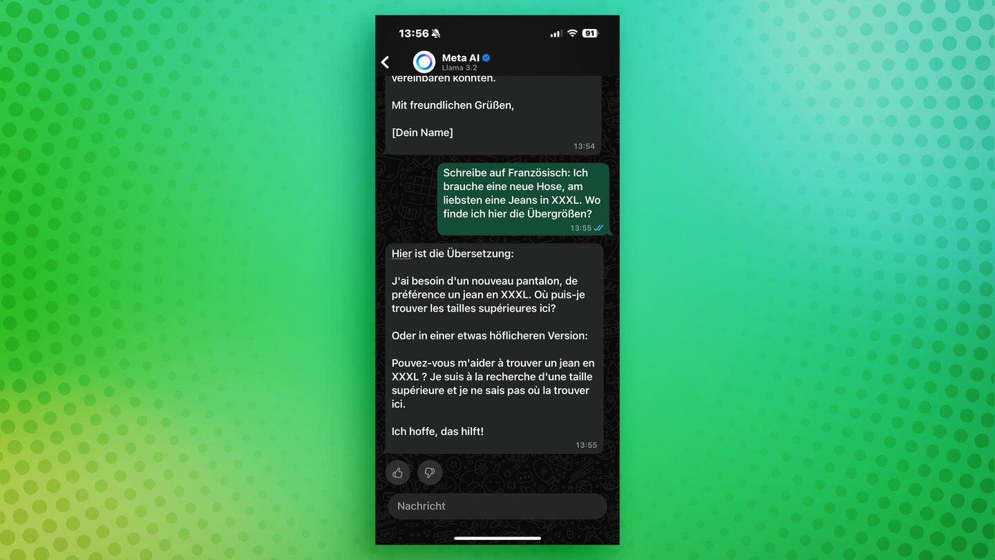 Meta AI gibt es nicht nur auf Deutsch und Englisch, auch Französisch, Italienisch, Spanisch, Portugiesisch und Hindi funktionieren. Wenn ihr also eine schnelle Übersetzung für etwas braucht, dann fragt einfach Meta AI.