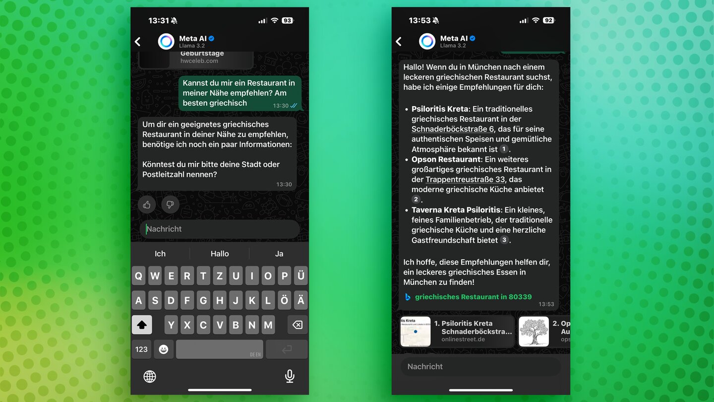 Ihr könnt Meta AI auch für persönliche Empfehlungen auf die Schnelle nutzen. So könnt ihr etwa nach Restaurants, Kinos und sonstigen öffentlichen Orten in eurer Nähe fragen.