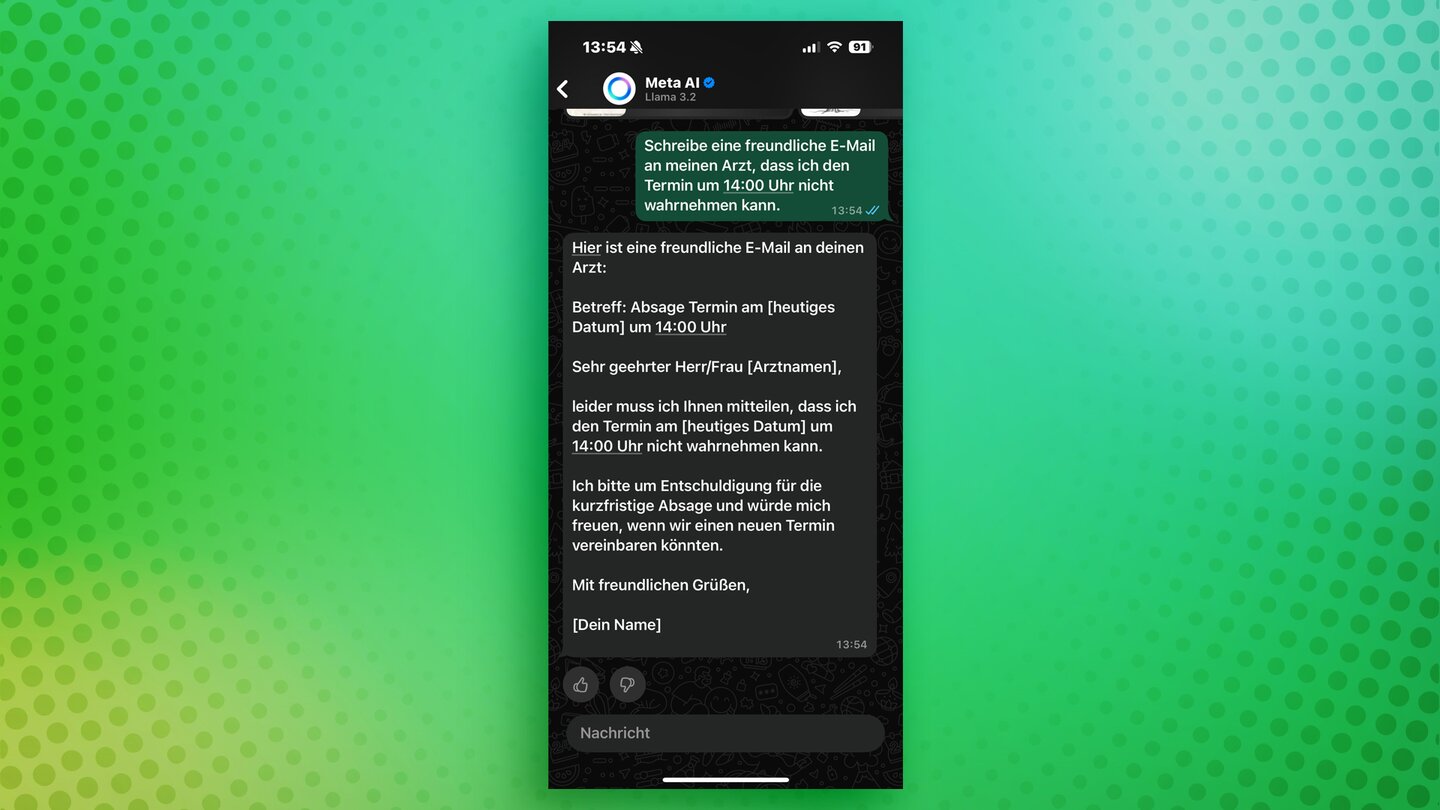 Bei einer einfacheren Schreibaufgabe kann euch Meta AI unterstützen. Die KI kann euch keinen Roman schreiben, aber eine kleine E-Mail kann euch die KI problemlos verfassen.