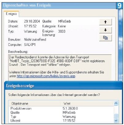 Meist sind die Aussagen der Fehlereinträge eher verwirrend als hilfreich. Unter Windows XP sind Ereigniseinträge mit einem Link zu einer Microsoft-Seite versehen. Klicken Sie darauf, müssen Sie erlauben, dass Windows die relevanten Informationen an Microsoft übermittelt. Akzeptieren Sie mit JA, öffnet sich das Hilfe- und Support-Center, das nach zusätzlichen Informationen zur betreffenden Ereignisnummer sucht.