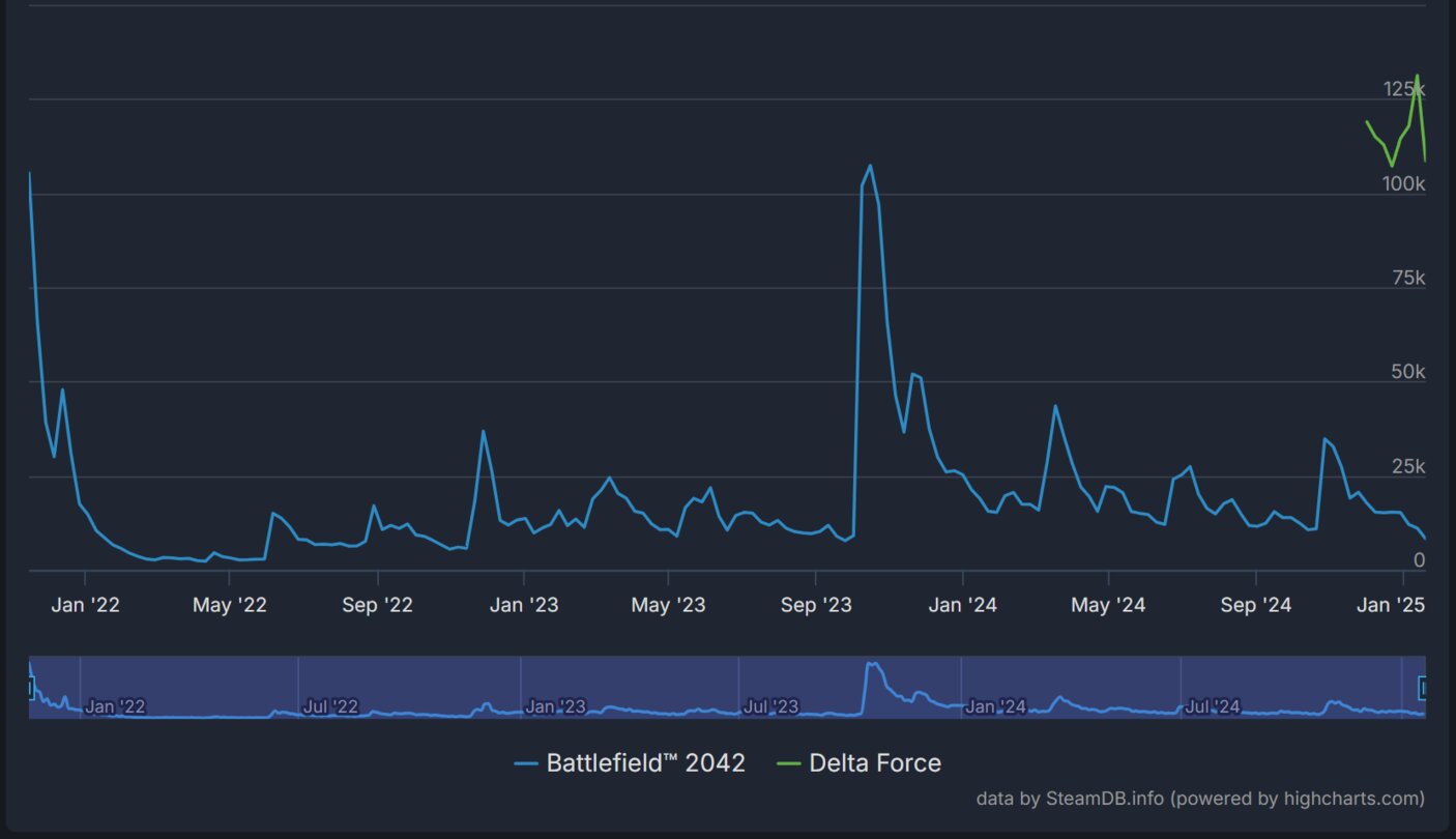 Auch zwei Tage nach dem Rekordhoch pendeln sich die Zahlen von Delta Force noch immer bei etwa 100.000 ein. Wie ihr anhand des Graphen von Battlefield 2042 jedoch sehen könnt, kann sich das genauso schnell wieder ändern. Gerade zu Release können vor allem Free-2-Play-Spiele astronomisch hohe Zahlen erreichen, die Krux liegt aber darin, eine beständige Spielerbasis zu halten.