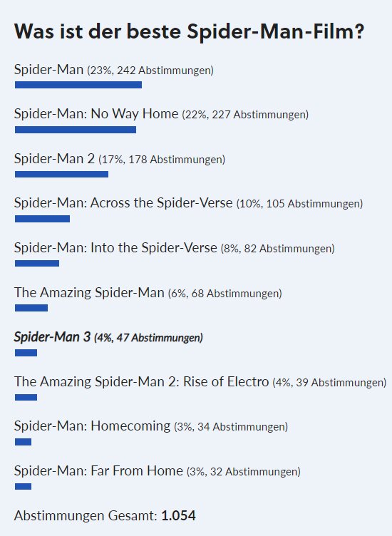 Zwar seid ihr euch sehr sicher, welche Filme in die Top-3 gehören, doch die Wahl eines Gewinners fiel euch offenbar schwer. Die drei Spider-Man-Ableger haben nämlich ähnlich viele Stimmen von euch erhalten. Besonders das Rennen um Platz 1 war haarscharf. Gerade Mal ein Prozent der Stimmen entschieden zwischen dem ersten und dem zweiten Platz: