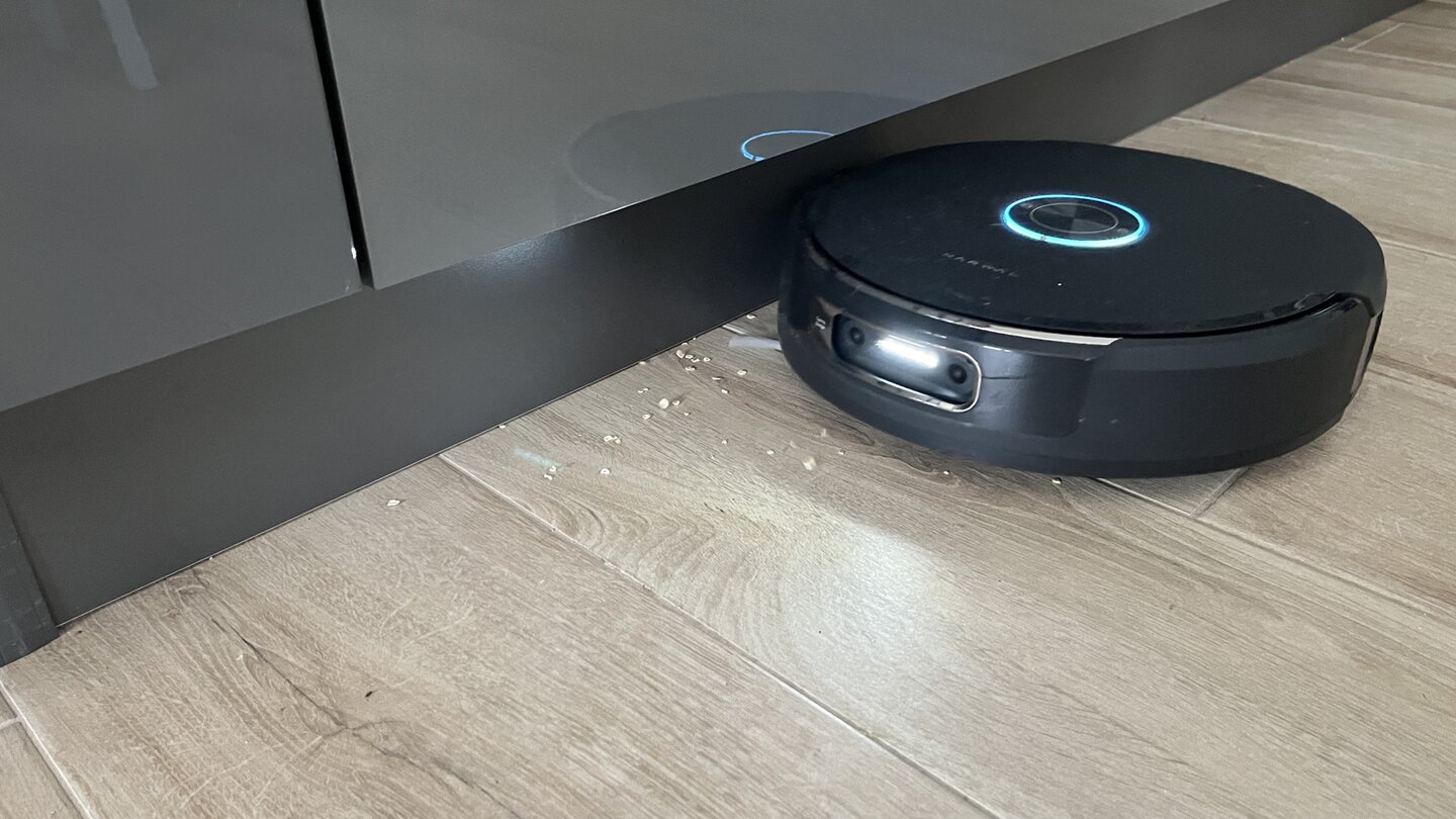 An den Kanten und Ecken wäre ebenfalls noch Luft nach oben. Die rechte Seitenbürste (eine zweite auf der linken Seite gibt es nicht) leistet gute Arbeit, schleudert aber wie bei vielen Konkurrenten gelegentlich grobe Krümel weg, statt sie einzusaugen.